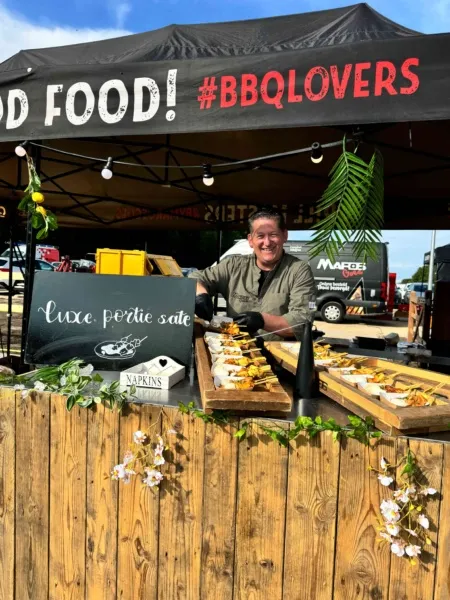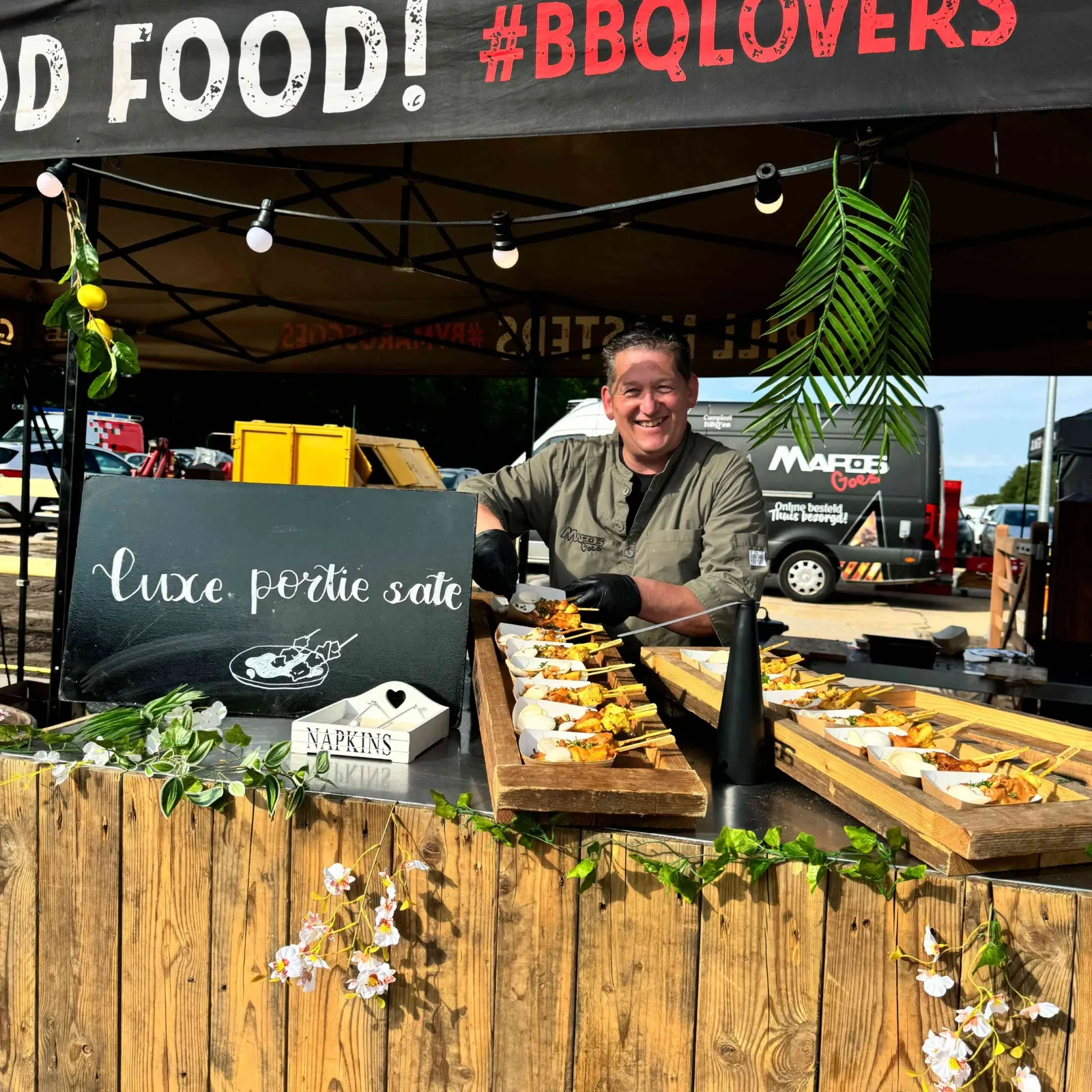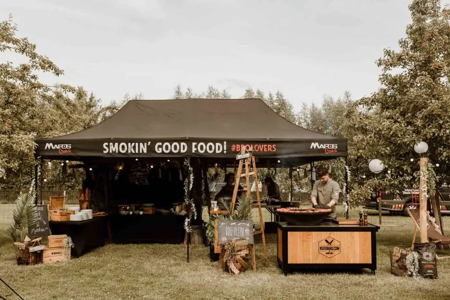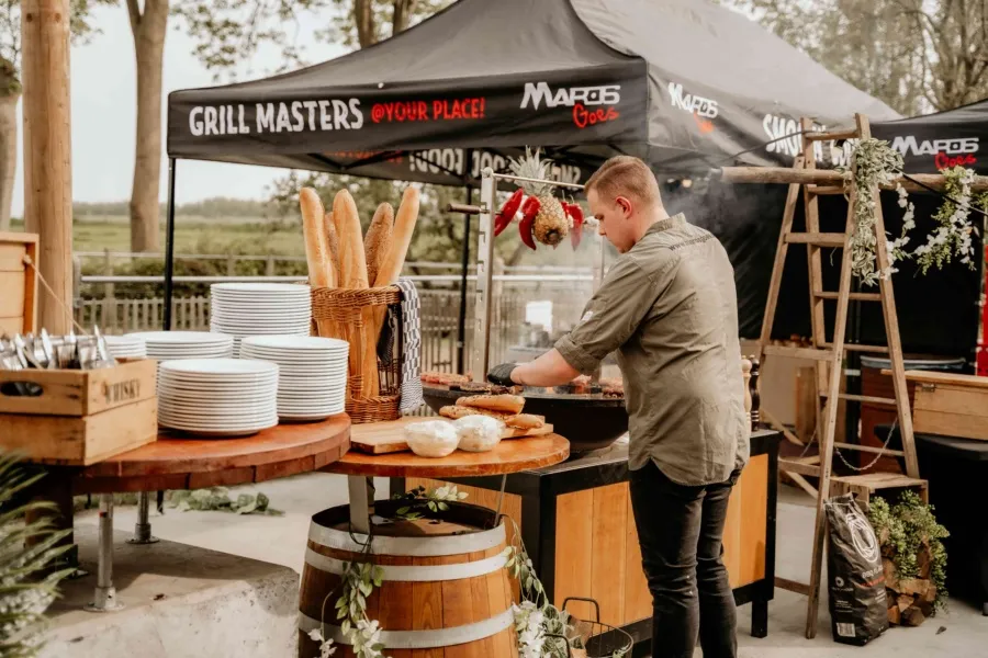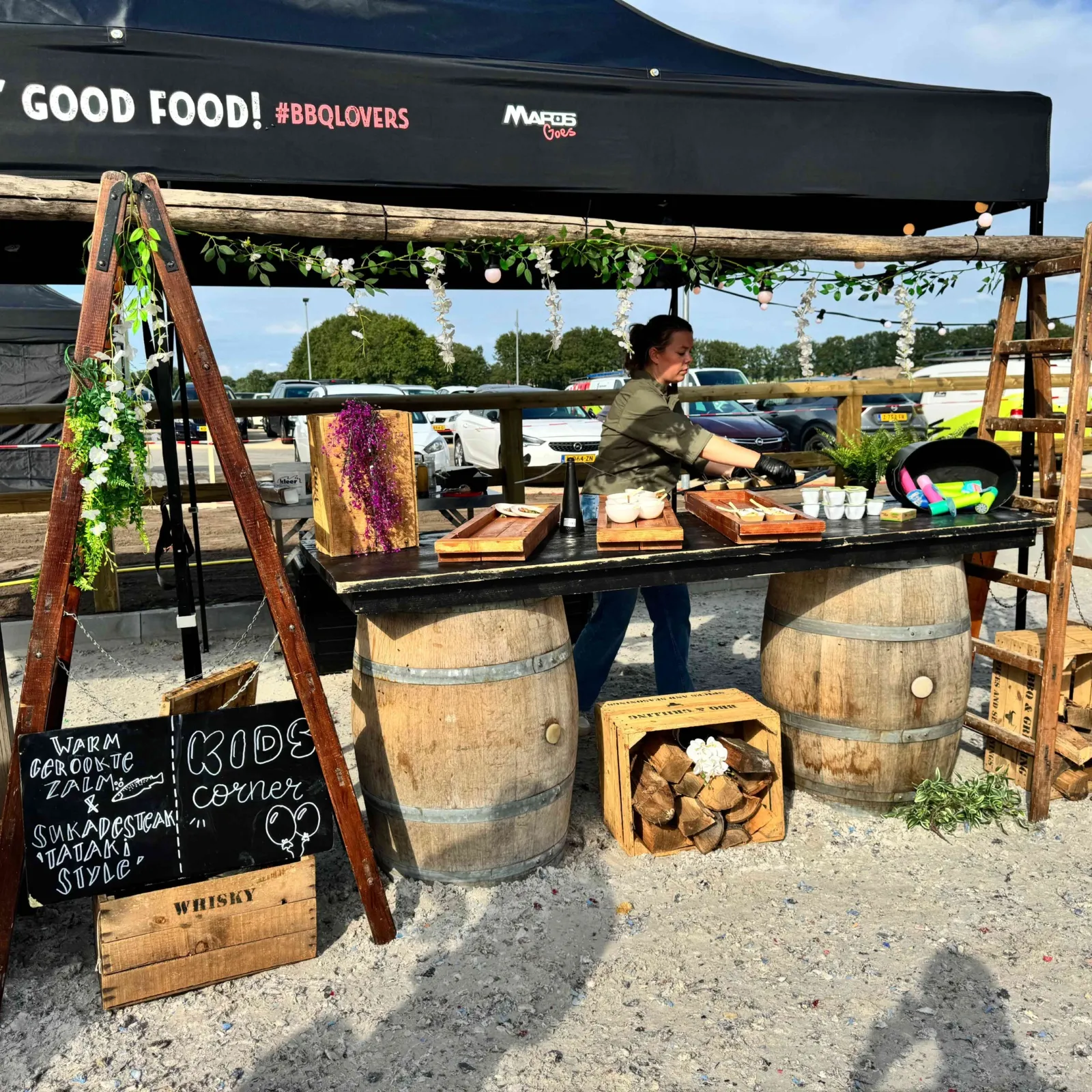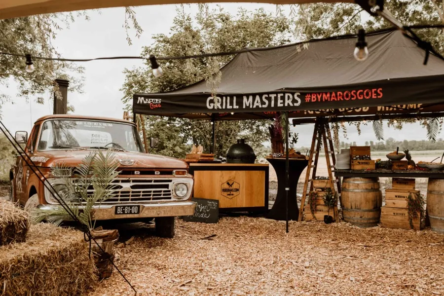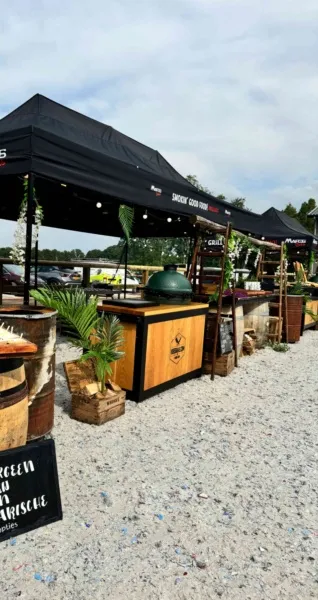 Wat deze barbecue extra bijzonder maakt, is de aankleding en uitstraling. Wij verzorgen een compleet gestylde setting met onder andere planten, bloemen en robuuste houten tafelbladen op wijnvaten. Alles is gericht op een warme, typische festivalsfeer waarin gasten zich vrij kunnen bewegen en genieten.