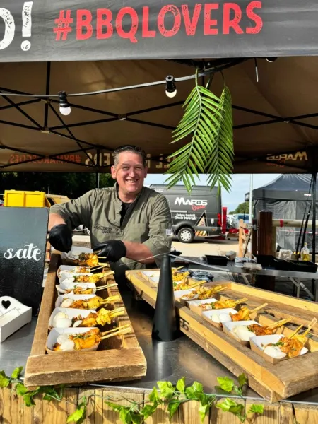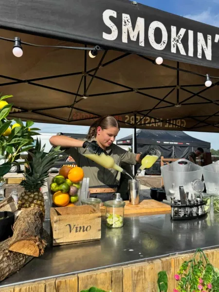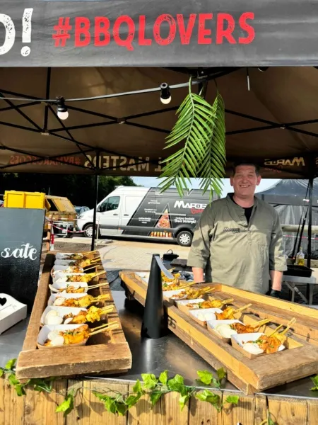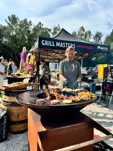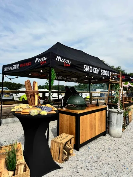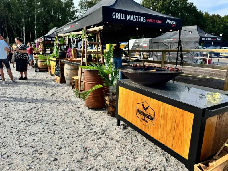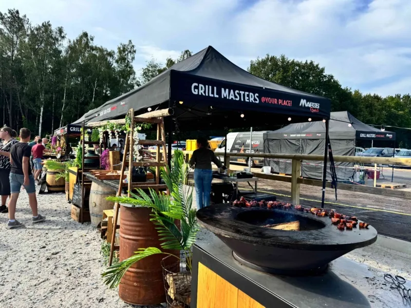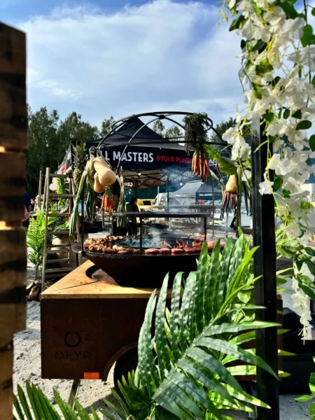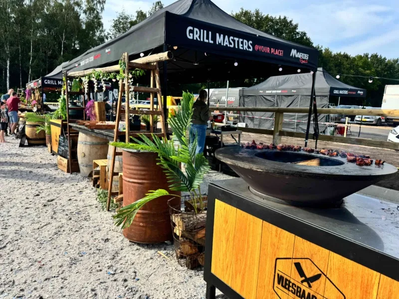 Verspreid over het terrein stonden onze Big Green Eggs en OFYR opgesteld, waar onze chefs live aan het werk waren. De geur van open vuur en ambachtelijke bereidingen zorgde direct voor een ontspannen en levendige sfeer. Op het menu stonden onder andere luxe porties saté, malse sucade steak, perfect gegaarde zalm met frisse pastasalade, een selectie van ribs en wings en nog veel meer. Gerechtjes die perfect passen bij deze setting, met de kwaliteit en aandacht die je van Vuurmeesters mag verwachten.