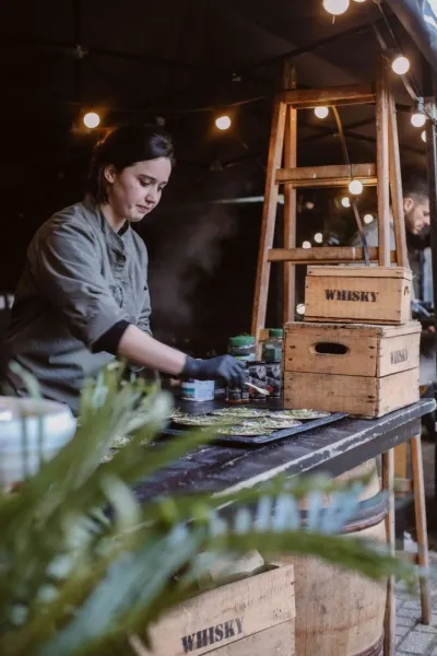 Bij aankomst werden de gasten ontvangen met een welkomstdrankje in een warm en stijlvol aangeklede omgeving. Met robuuste elementen, subtiele verlichting en karaktervolle details creëerden wij een festivalsfeer die zowel stoer als verfijnd aanvoelde. Een setting waarin iedereen zich direct op zijn gemak voelde en de toon werd gezet voor een ontspannen en bijzondere avond.